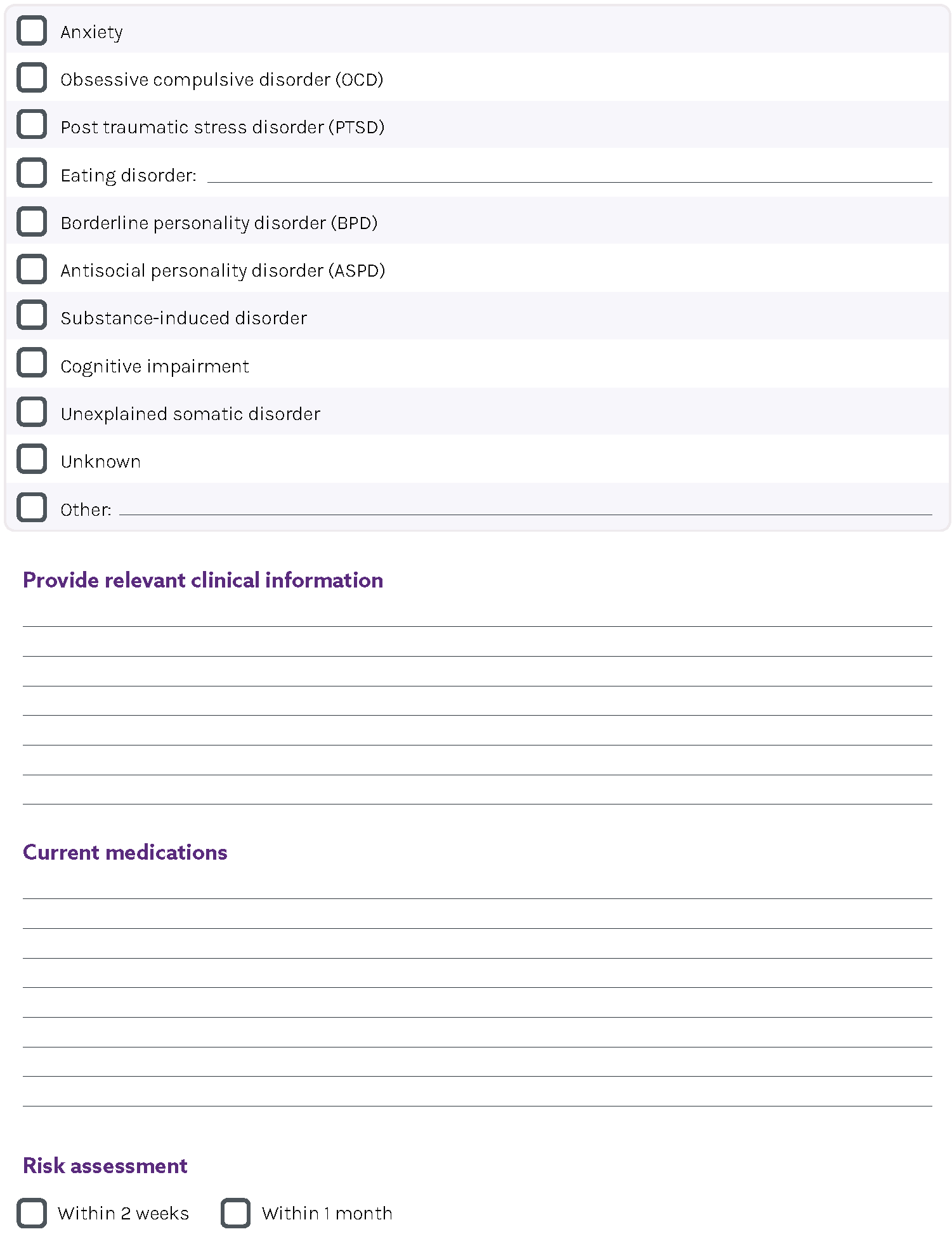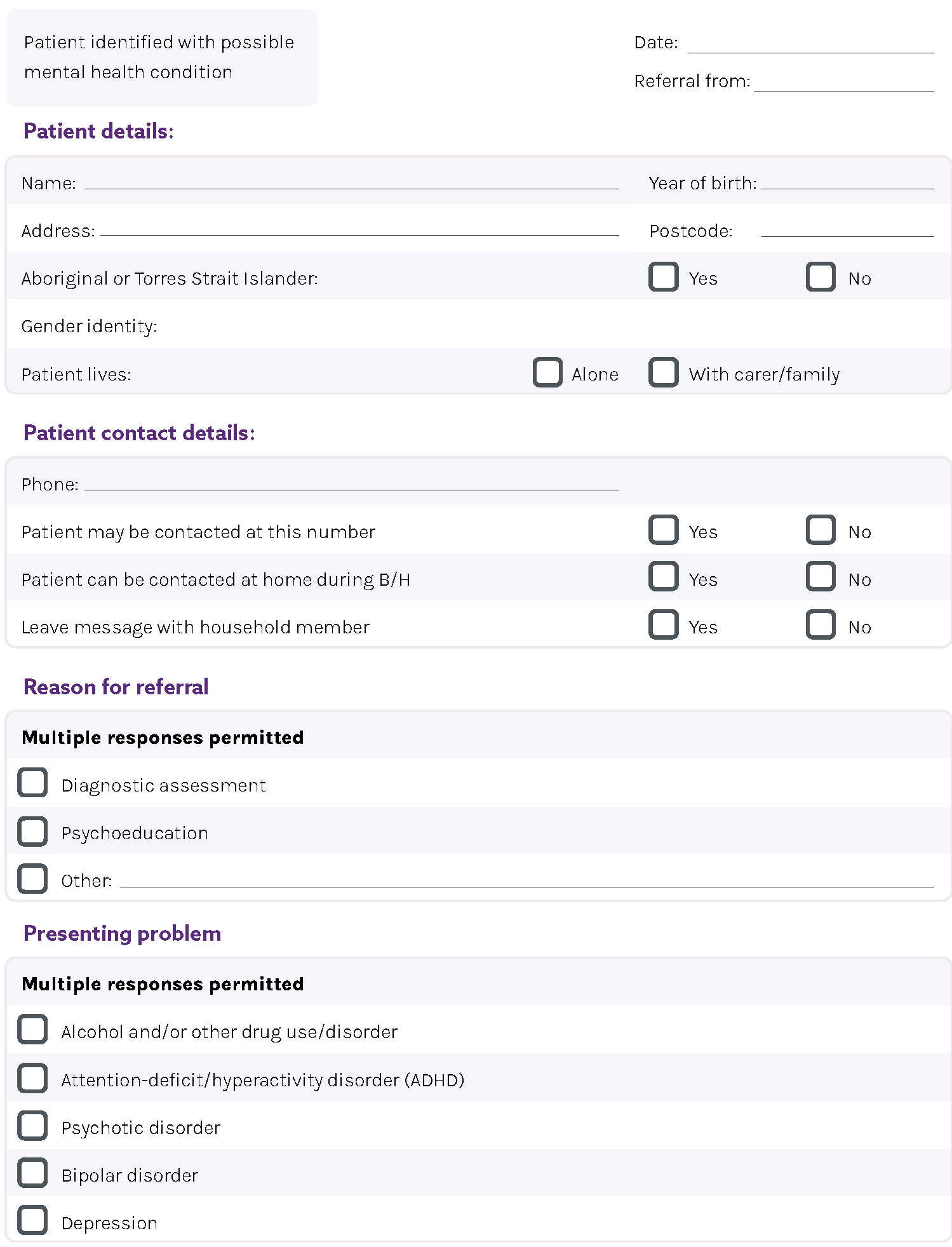 Chapter List Guidelines In a nutshellAbout these guidelinesPart A: About co-occurring conditionsPart B: Responding to co-occurring conditionsPart C: Specific population groupsAppendicesAppendix A: Other Australian guidelinesAppendix B: Other useful resourcesAppendix C: Sources of research, information and other resourcesAppendix D: DSM-5-TR and ICD-11 classification cross-referenceAppendix E: Motivational interviewingAppendix F: Case formulation tableAppendix G: Mental state examinationAppendix H: Integrated Motivational Assessment Tool (IMAT)Appendix I: Additional screening toolsAppendix J: CANSAS-PAppendix K: Depression Anxiety Stress Scale (DASS 21)Appendix L: Indigenous Risk Impact Screener (IRIS)Appendix M: Kessler psychological distress scale (K10)Appendix N: The PsyCheck Screening ToolAppendix O: Adult ADHD Self-Report Scale (ASRS)Appendix P: The International Trauma Questionnaire (ITQ)Appendix Q: Life Events Checklist for DSM-5 (LEC-5)Appendix R: Primary Care PTSD Screen for DSM-5 (PC-PTSD-5)Appendix S: PTSD Checklist for DSM-5 (PCL-5)Appendix T: Psychosis Screener (PS)Appendix U: Alcohol Use Disorders Identification Test (AUDIT)Appendix V: CAGE Substance Abuse Screening ToolAppendix W: Drug Abuse Screening Test (DAST-10)Appendix X: Drug Use Disorders Identification Test (DUDIT)Appendix Y: The Michigan Alcohol Screening Test (MAST)Appendix Z: Suicide risk screener scorer and interpretationAppendix AA: Referral pro formaAppendix BB: Cognitive behavioural techniquesAppendix CC: Anxiety management techniquesWorksheetsAbbreviationsGlossaryReferencesDisclaimer and acknowledgements Download full Guidelines Appendix AA: Referral pro forma Download page Download section Previous Next